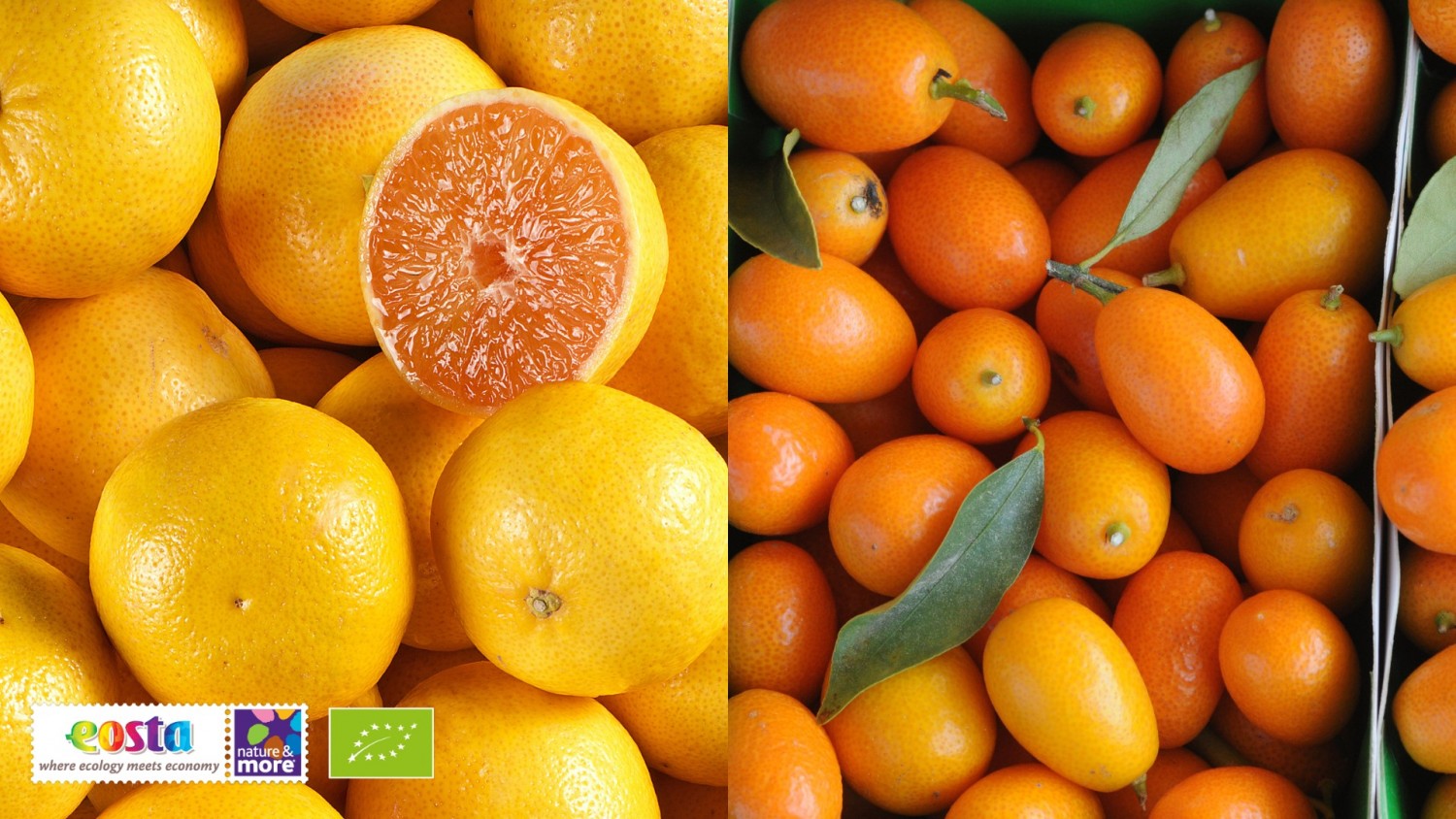 Neu im Eosta-Sortiment sind biologische Wekiwa (Tangelolo) und Kumquats. Die Tangelolo ist eine auffällige Kreuzung aus Mandarine und Pomelo. Von außen sieht sie aus wie eine Mandarine, aber innen wie eine Pomelo - mit einem frisch-süßen Geschmack und einer leicht bitteren Note. Eine exotische Zitrusfrucht mit Potenzial, erhältlich von Oktober bis März.