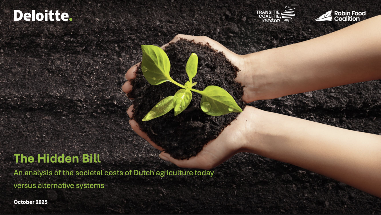 The Hidden Bill: Reshaping Dutch Agriculture was carried out by Deloitte on behalf of the Robin Food Coalition and the Food Transition Coalition. The analysis quantifies, for the first time, the social costs of the Dutch agricultural and food system and compares them with alternative pathways to make the sector more sustainable. The calculations are based on available data, assumptions from recognised standards and knowledge sources, and insights from interviewed experts.