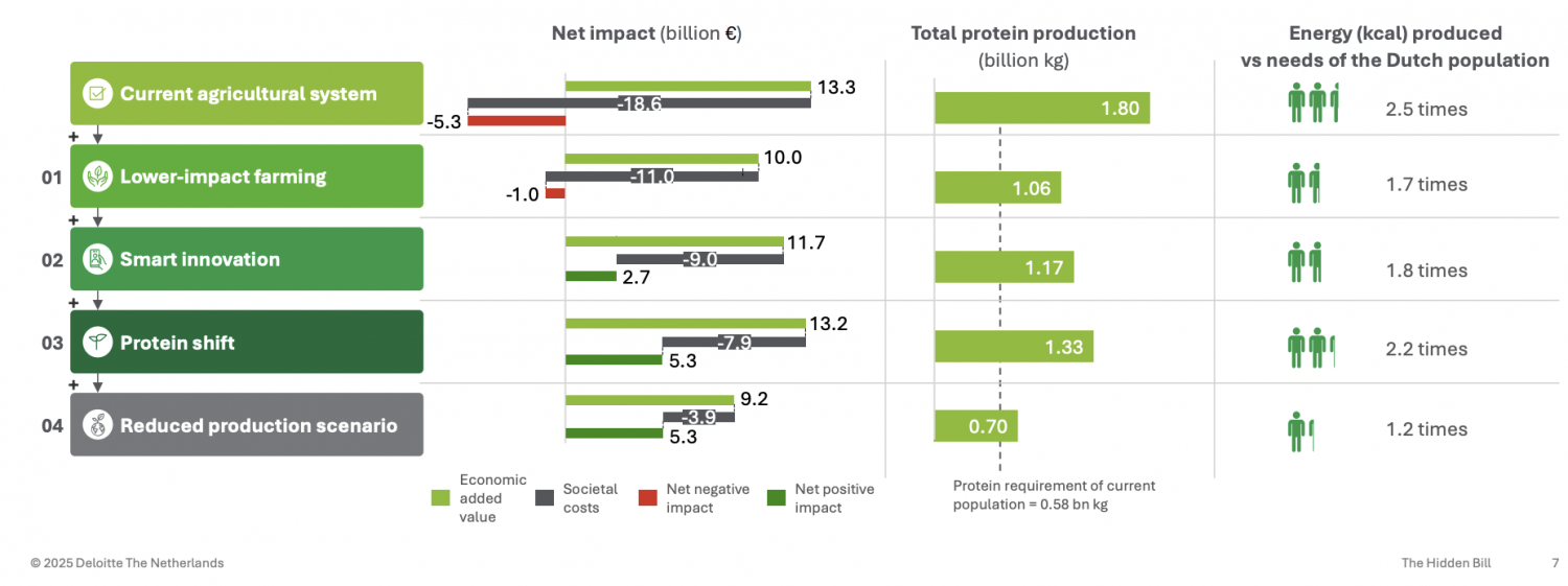 Nevertheless, the study also offers perspective. With a shift towards sustainable (organic) cultivation, smart innovation and a shift to plant-based proteins, the social balance in the Netherlands could shift to a positive €5 billion per year.
