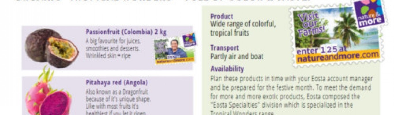 Ons biologische Tropical Wonders assortiment is een breed, kleurrijk en vooral heerlijk assortiment van exotisch fruit, met passie gekweekt door onze Nature & More telers van over de hele wereld. Hieronder vind je een goede selectie van de Tropical Wonders die we te bieden hebben. Neem contact op met uw Eosta account manager voor alle details!